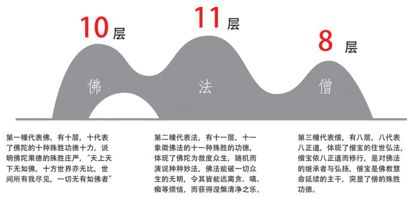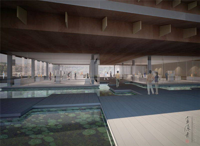 禅院由世界著名建筑师设计,整体轮廓似山形,寓意佛、法、僧三宝,与毗邻的钱塘江形成了浑然一体的山形水意自然意境,体现了江南地区传统建筑中的水系元素与文化内涵,且不失革新的现代建筑理念。