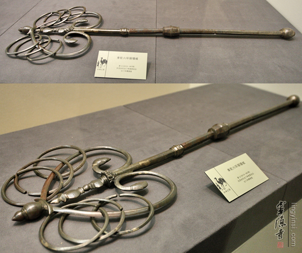 ▲法门寺出土唐代鎏金二股六环铜锡杖