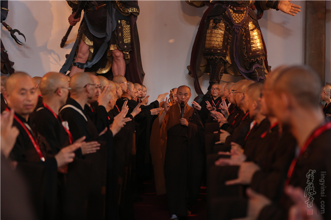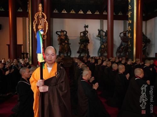 三坛大戒正受菩萨戒后,大师父传授锡杖仪,众新戒右手持印触锡杖,寓意获得加持。