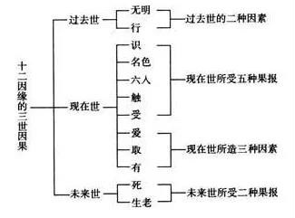 因此佛陀用这十二因缘,说明了凡夫众生的过去、现在、未来的三世之中,所有因果循环的流转现象。此可用下面的表解,帮助我们,理解它的一个概念: