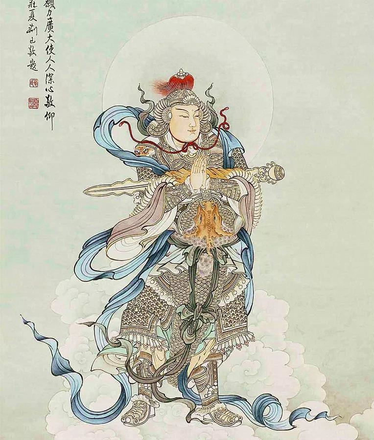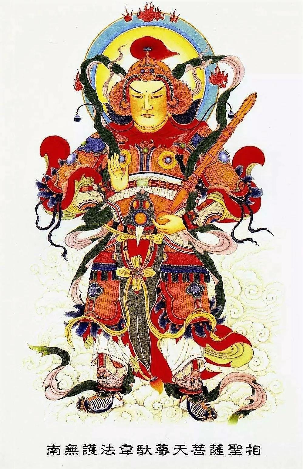 每尊佛菩萨都有无量的护法眷属,护法神不仅充当守护佛教的职责,还负责保护佛子,具有息灾、增益、敬爱、降伏等四种济世功德。在这些护法神中,最具体表性的就是韦驮菩萨。