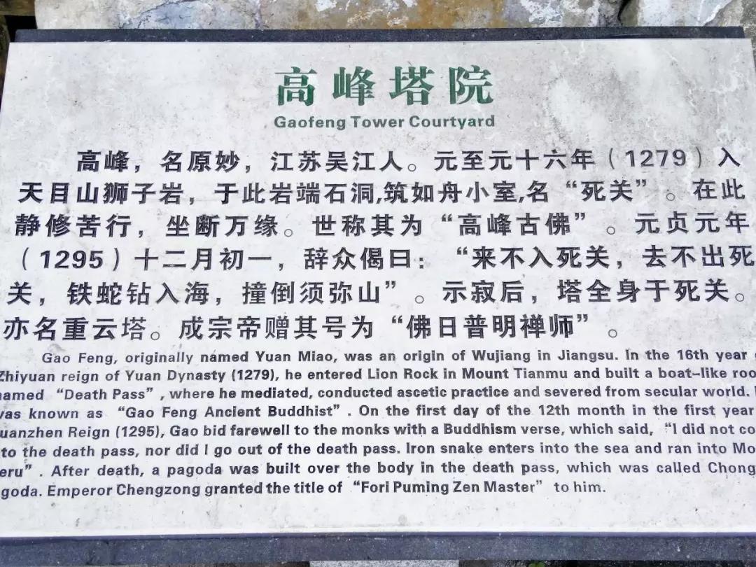高峰原妙禅师(1238-1295),是临济宗雪岩祖钦禅师最著名的弟子。苏州吴江人,十五岁出家,十七岁受具足戒,先学天台教义,二十岁到杭州净慈寺拜谒断桥妙伦禅师,立死限三年,勤苦修道。后参叩雪岩祖钦,终获法意。元十六年(1279),高峰禅师来到天目山西峰,于师子岩修葺茅棚居住。