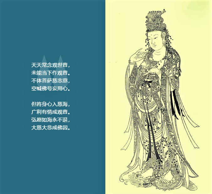 对观世音菩萨的信仰,不能仅仅于灾变、疾病、急难之际,求观世音菩萨帮忙,更应该效法观世音菩萨,学习如何变成观世音菩萨的化身之代表,去帮助苦难中的众生。