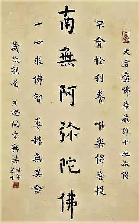 弘一法师善巧方便以书法书写华严经等大乘经典中佛经妙语结缘给世人。他书写佛经,一幅一行、一字一款、一笔一划、一章一印,都凝神静气,恭敬认真以求。法师的墨宝、诗词,人见人爱,历久不磨,他全身心以赴、认真仔细地进行创作,终使"字如其人"不少人因为珍爱法师书法,对法师墨宝中经文妙理有所感悟,最终皈依佛门。