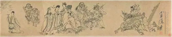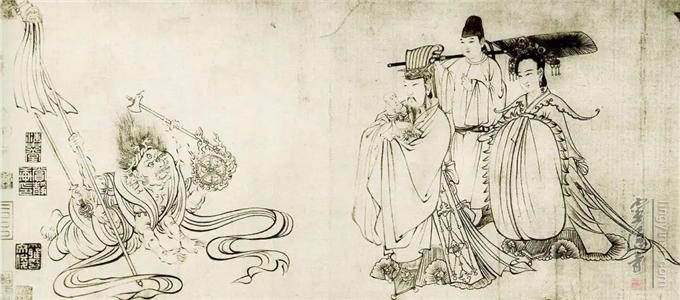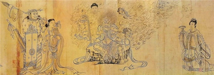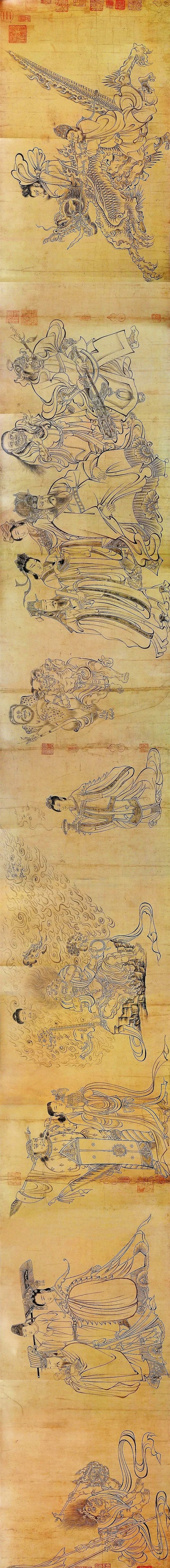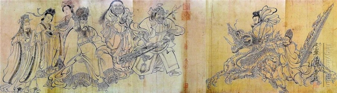 图中绘人物、鬼神、瑞兽二十多个,人物则天王威严,大臣端庄,夫人慈祥,侍女卑恭,鬼神张牙舞爪,瑞兽灵活飞动,极富想象力而又画得极富神韵。就这两部分来看,激烈与平和,怪异与常态,天上与人间,高贵与卑微,疏与密,动与静,喜与怒,爱与恨,构成比照映衬又处处交融相合。