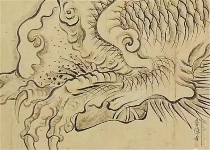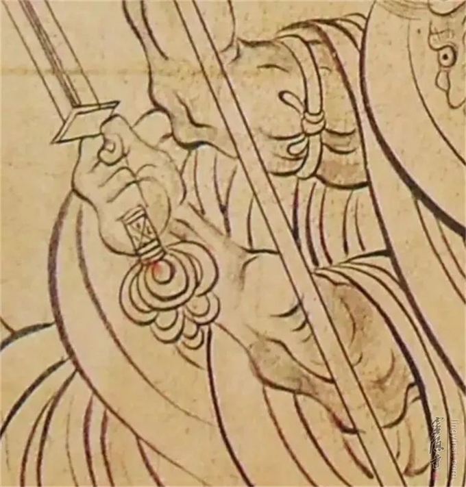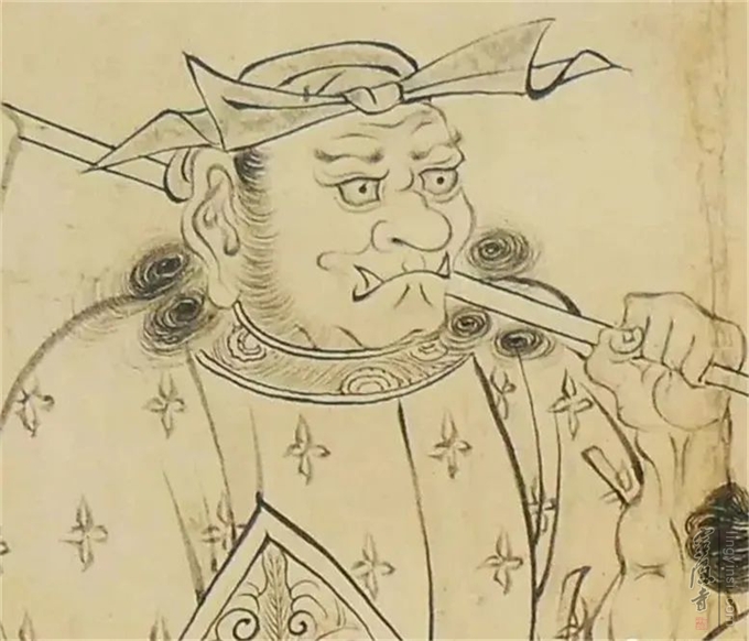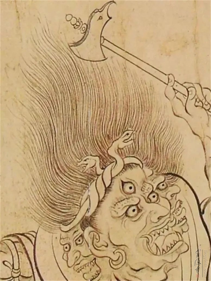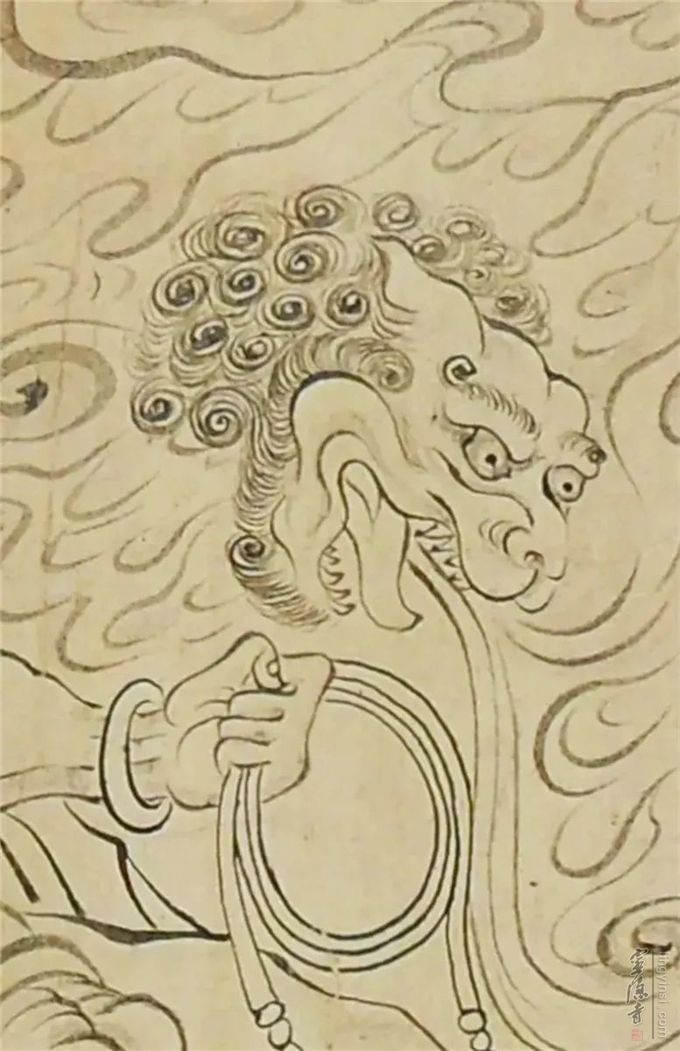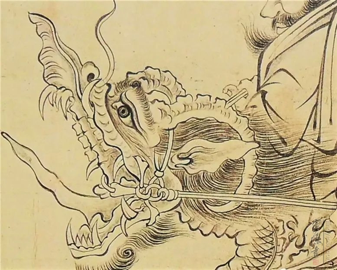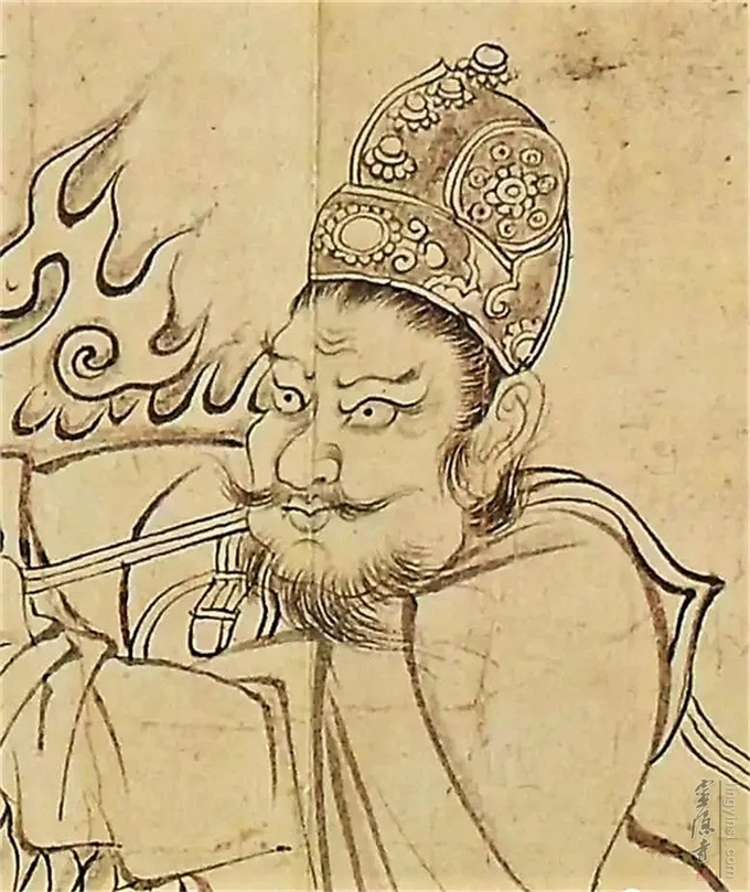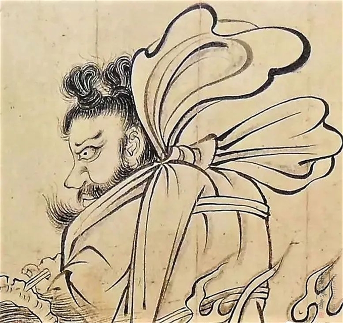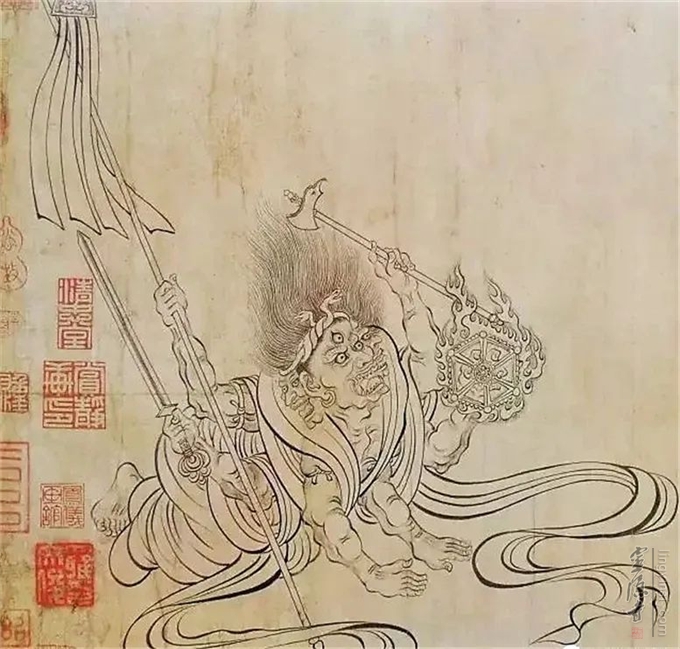 独特的"吴家样"线描,粗细顿挫,随心流转,无论是表现人物的衣纹、鬼神的狰狞,还是描绘闪烁的火光,都表现得生动贴切,游刃有余。