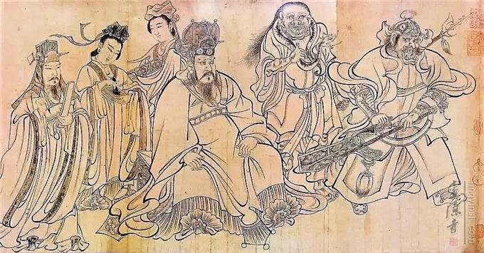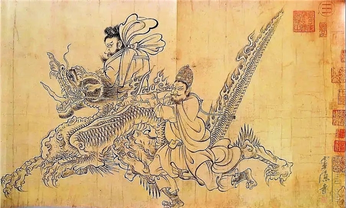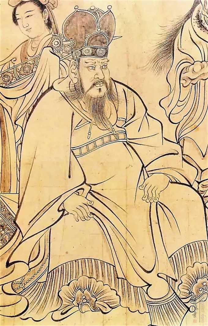 描绘一位王者气度的天神端坐中间,两旁是手执筋板的文臣、捧着砚台的仙女,以及仗剑围蛇的武将力士面对一条由二神降伏的巨龙。