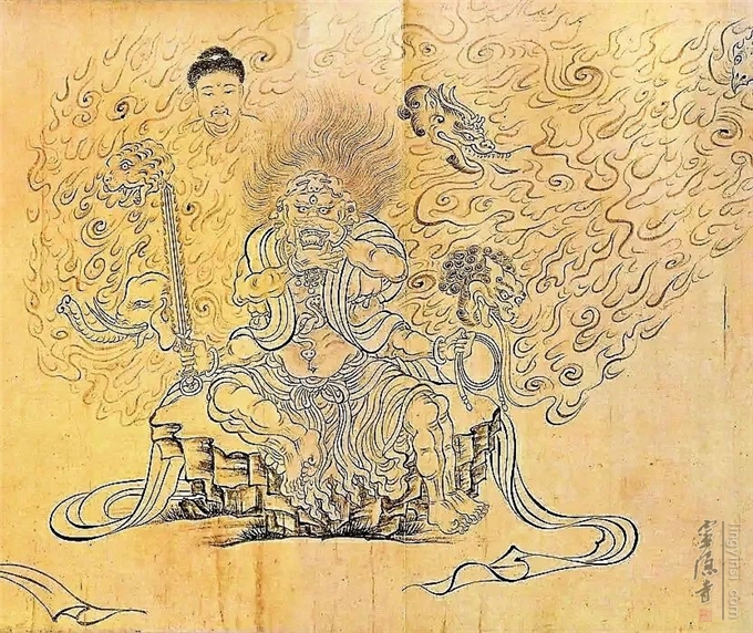 画的是一个踞坐在石头之上的四臂披发尊神,身后烈焰腾腾。神像形貌诡异,颇具气势,左右两边是手捧瓶炉法器的天女神人。