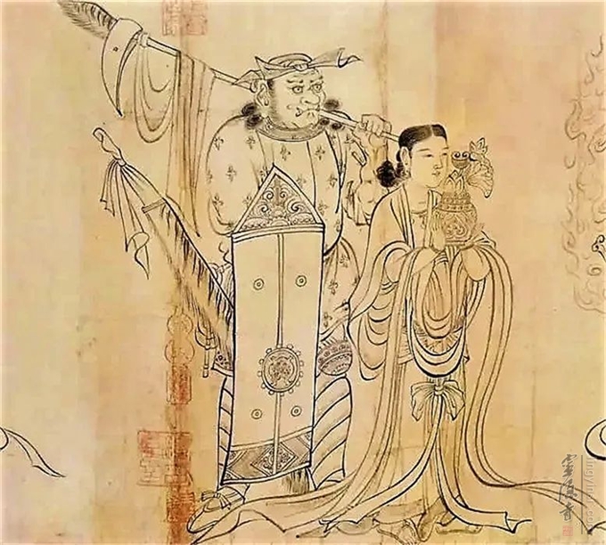 《送子天王图》由唐人吴道子所做,图又名《释迦降生图》,乃吴道子根据佛典《瑞应本起经》绘画。