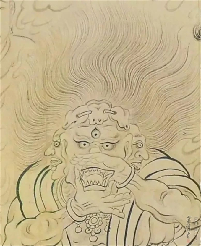 中间一段则作如来护法神大自在天端坐石上情形。大自在天作四臂披发形象,踞坐石上,背后烈焰腾腾,火焰中现出虎、象、狮、龙、鸟头,形貌诡怪,左右作有捧花瓶、香炉法器的天女和执帚天神。