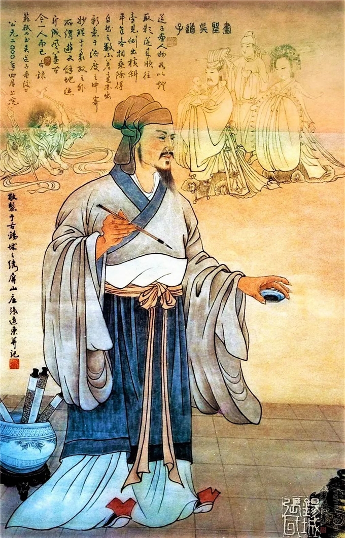 吴道子(约680-759年),唐代画家。画史尊称画圣。又名道玄。汉族,阳翟(今河南禹州)人。约生于永隆一年(680) ,卒于乾元元年(758)前后。少孤贫,初为民间画工,年轻时即有画名。曾任兖州瑕丘(今山东滋阳)县尉,不久即辞职。后流落洛阳,从事壁画创作。开元年间以善画被召入宫廷,历任供奉、内教博士、宁王友。曾随张旭、贺知章学习书法,通过观赏公孙大娘舞剑,体会用笔之道。擅佛道、神鬼、人物、山水、鸟兽、草木、楼阁等,尤精于佛道、人物,长于壁画创作。