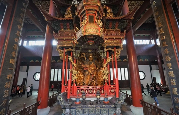 杭州灵隐寺天王殿供奉的韦陀菩萨立像,高二点五米,头戴金盔,身裹甲胄,威严端肃,正气凛然,雕刻精细。这尊雕像用整段香樟木雕造,是南宋留存至今的珍贵遗物,已有800多年的历史。