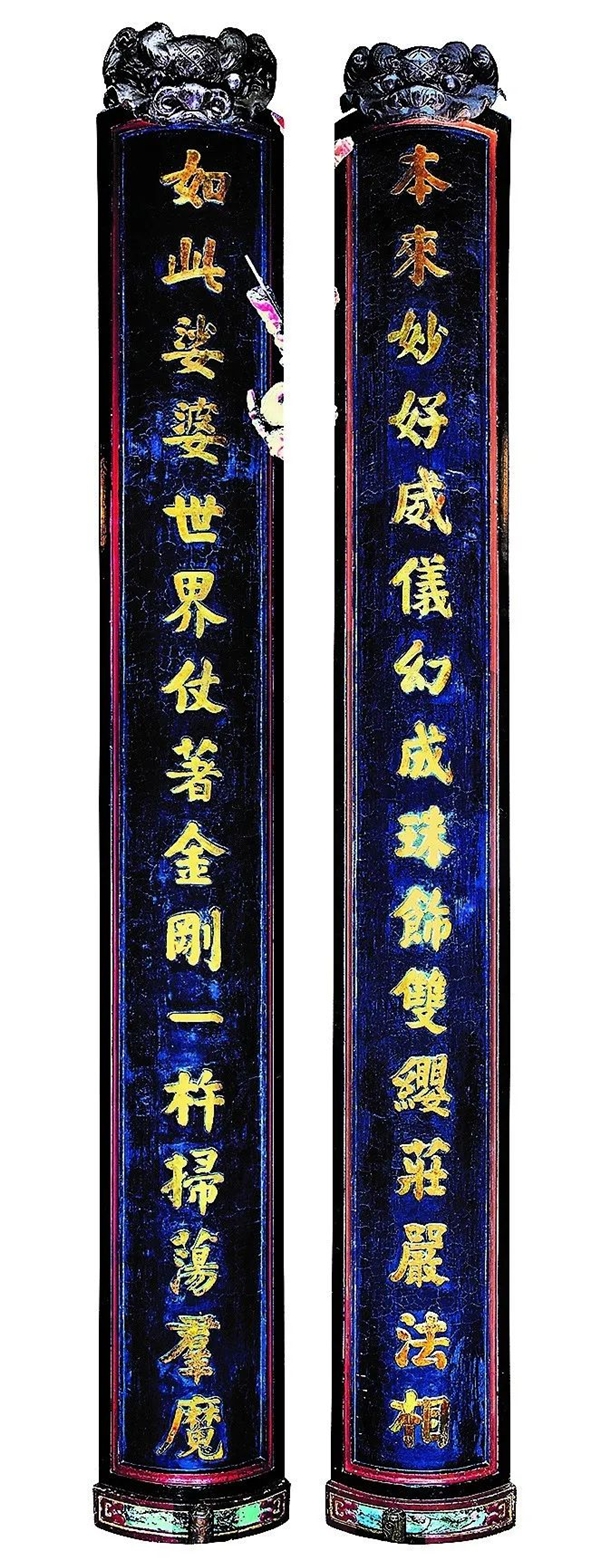 韦驮菩萨座前的这幅楹柱联,写护法神将的庄严法相,又赞扬韦驮菩萨的功德。“幻成珠饰双缨”,即指菩萨幻化成天将形象,手持金刚杵巡视三洲,除魔护法,保护着寺院的安宁。