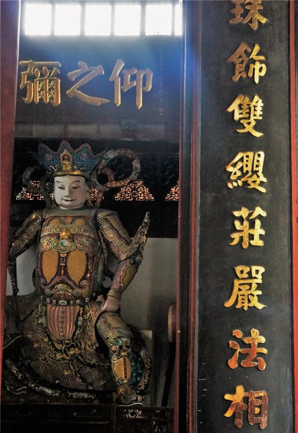 此楹联对仗工整,书法也用极为工稳的行楷,运笔稳实有力,笔画工整挺健,线条流畅明快,与威风凛凛的韦驮菩萨立像,相映相成。