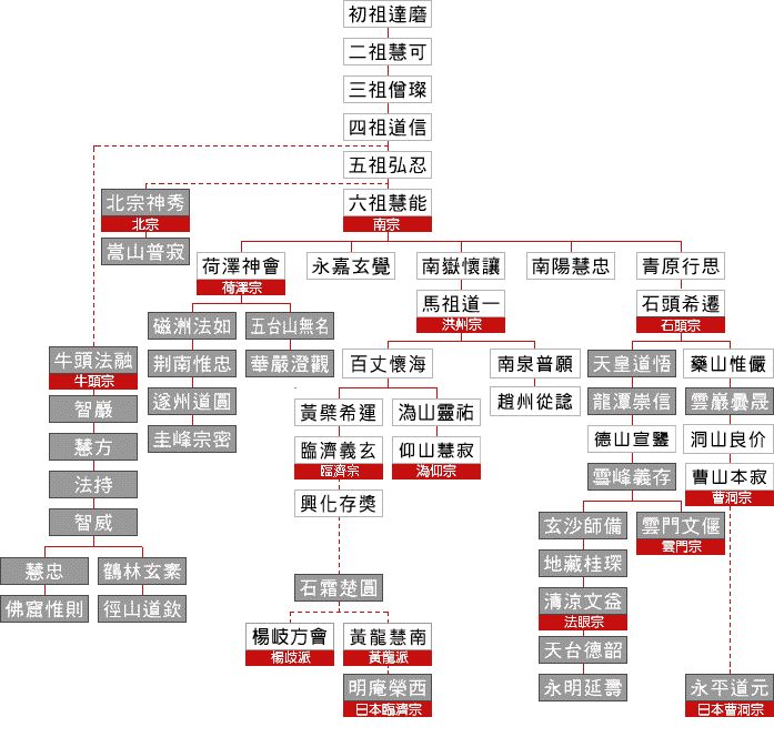 禅宗自六祖惠能大师以后,衍成临济、曹洞、云门、沩仰、法眼五派,称为一花五叶。正应了达磨祖师对二祖慧可大师说的那句偈语:“一花开五叶,结果自然成。”