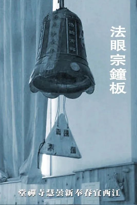 法眼宗法脉重续,钟板样式经虚云老和尚确认为三角形,以展扬由文字行持等种种方便,圆满法身功德,成就三类化身,广度众生。字句为“三类化身”。