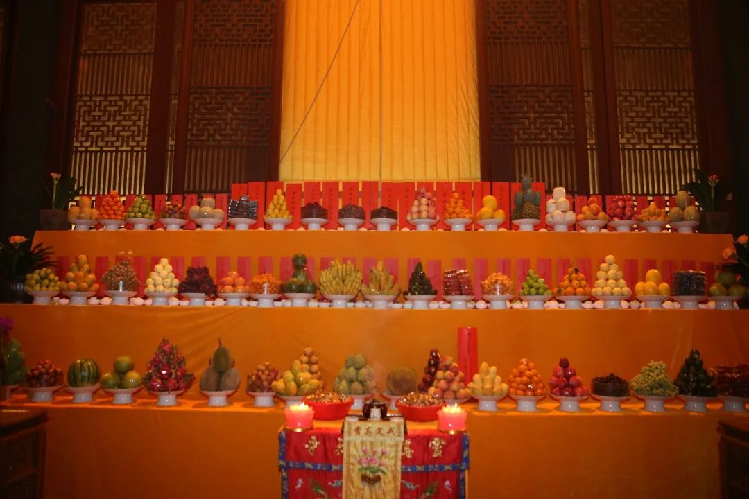 为了表达最高的敬意,斋天坛场设佛、法、僧三宝席,以及诸天和其侍从的座席。一切的供品应当极尽庄严、清净,法会的礼赞唱诵力求如法如仪;茶水、供品、菜蔬也要讲求洁净新鲜。