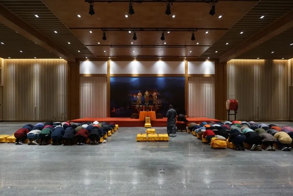 24日凌晨五点,许多学员平时这个时间都还沉浸在睡梦之中,而此刻的他们已经穿戴整齐,身着海清,来到殿堂参加早课。梵呗阵阵,佛号声声,大家在唱诵与礼拜之中开启了新的一天……