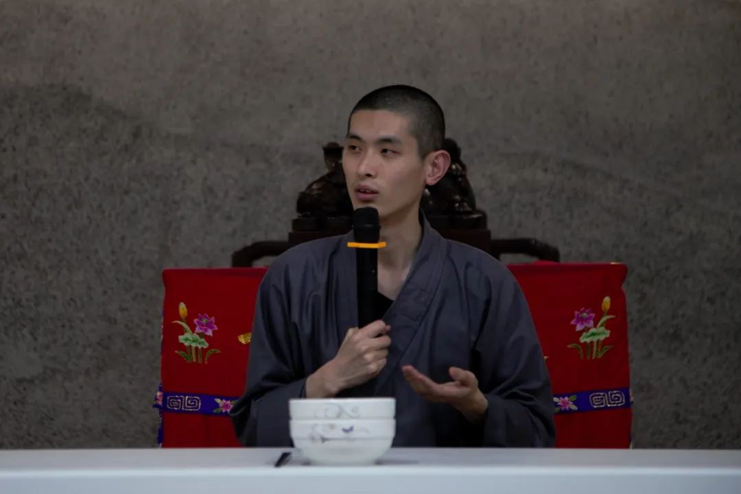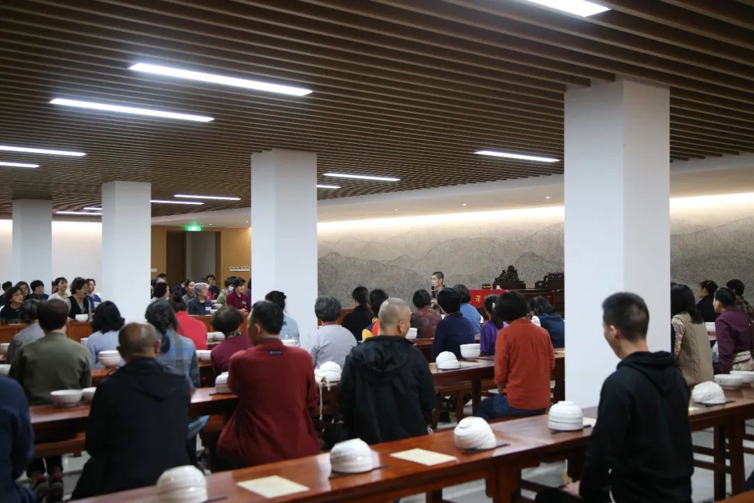 在斋堂中,能量法师向学员们讲授过堂规矩和食存五观的具体内涵,并且通过现场演示为大家解释各种手势所表示的含义。能量法师说:我们在寺院中吃饭也是一种修行,与大家日常生活中散心杂话的吃饭不同。在寺院过堂,不仅举止要合乎一系列规矩和威仪,内心也要牢记五种观想,止息杂念。因此过堂并不是一件简单的事情,需要各位学员认真对待。