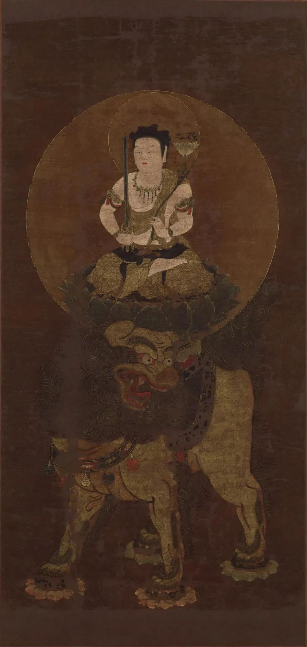 文殊菩萨的形象,通常是身紫金色,形如童子,五髻冠顶,右手握智慧剑,左手持的青莲花上放置般若经。智慧利剑能斩断种种烦恼,青莲花代表纯洁无染,花上的般若经则作为智慧的象征。菩萨常以狮子为座骑,表示智慧威猛无比;或以莲花为台座,代表清净无染;或驾乘金色孔雀,比喻飞扬自在。