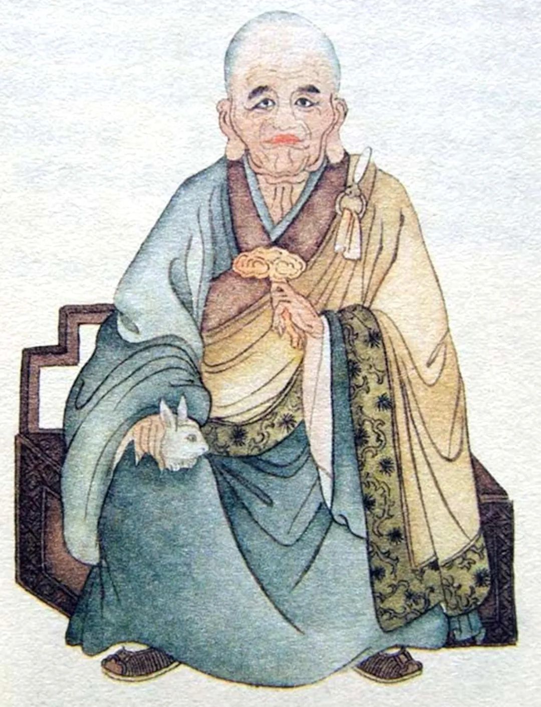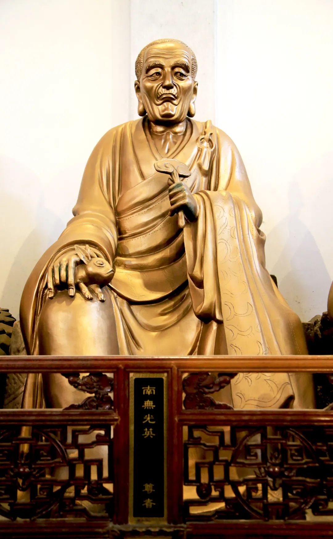 尊者法相所现为肃然端坐,左手于胸前执如意,右手护神兔于膝,大耳垂肩,神态宁静。尊者福慧双修,洞晓众生心思,随心随喜,以法教习。