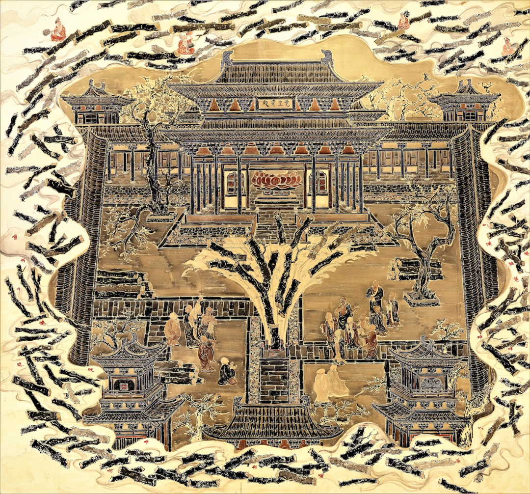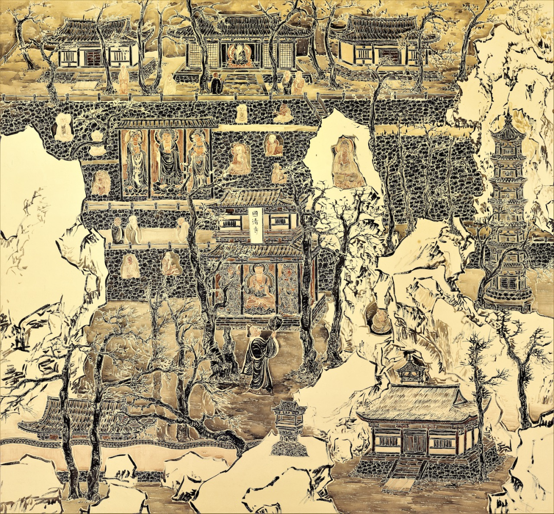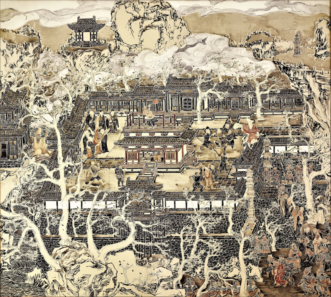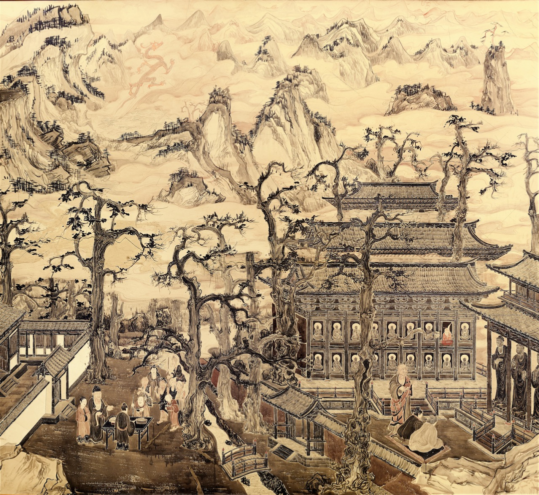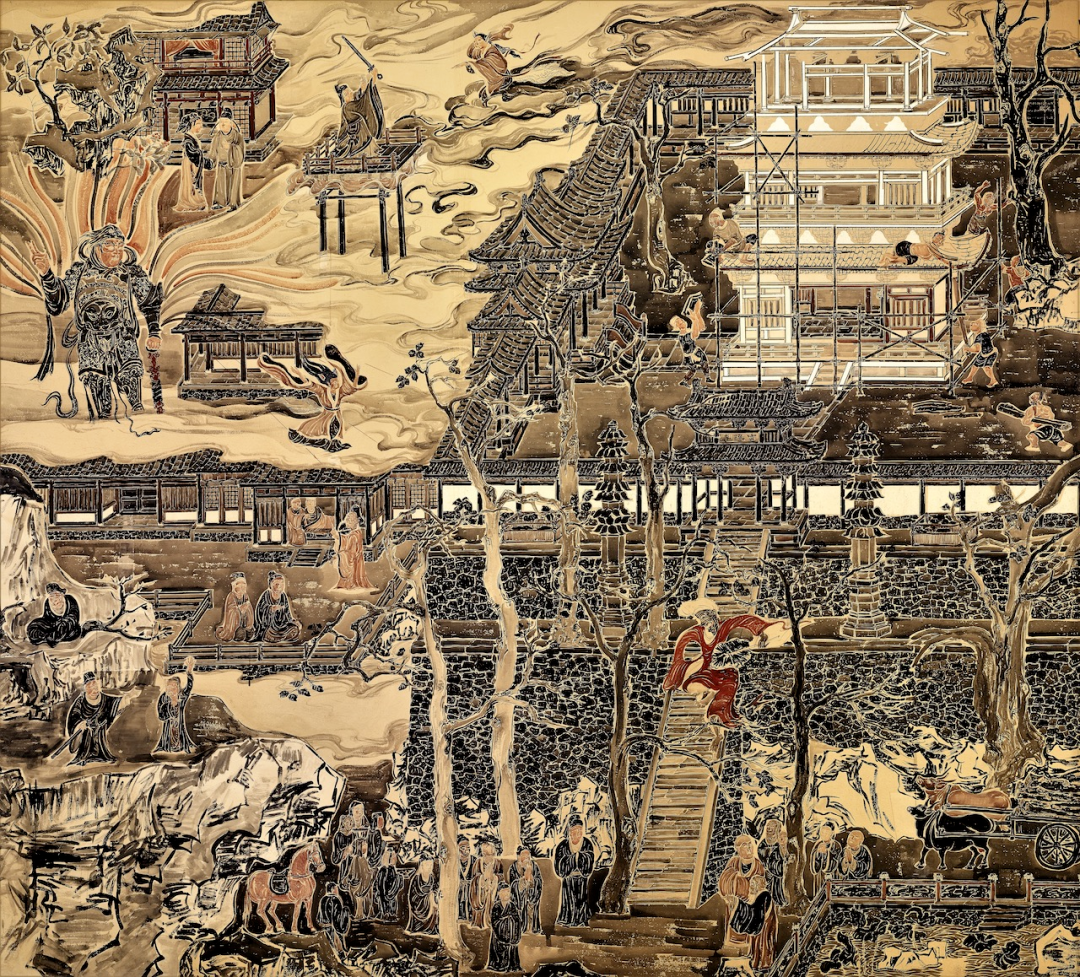 这十八幅壁画高三米、总长五十米,环绕济公殿四壁,色彩淡雅,如一幅江南山水画卷徐徐展开,展现着济公传奇的一生。从这些壁画中,人们还能看到南宋时的灵隐全貌,除了那笔意葱茏的山水景观,还能寻到许多当年都城的细节:灵隐寺、大悲楼、六和塔、净慈寺、雷峰塔、西湖、钱塘江……