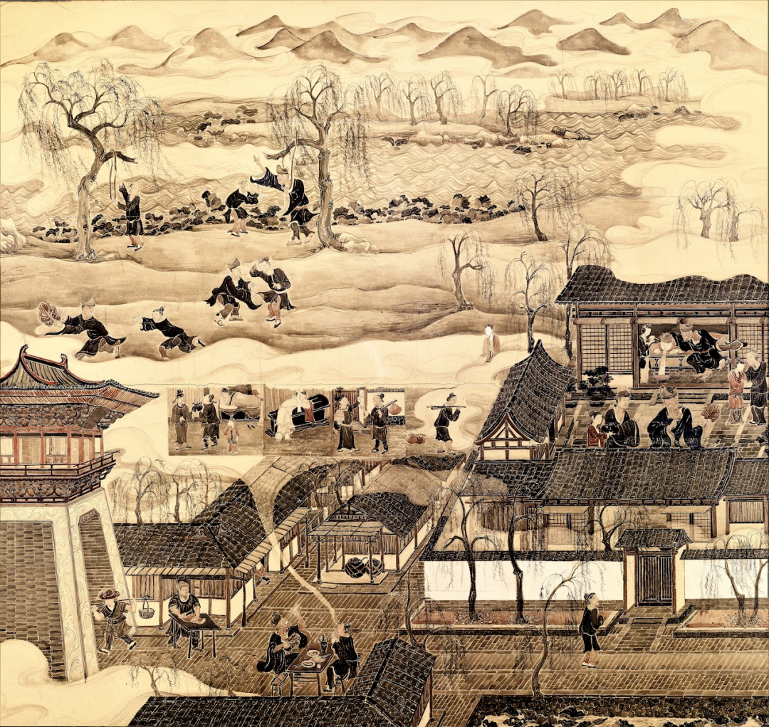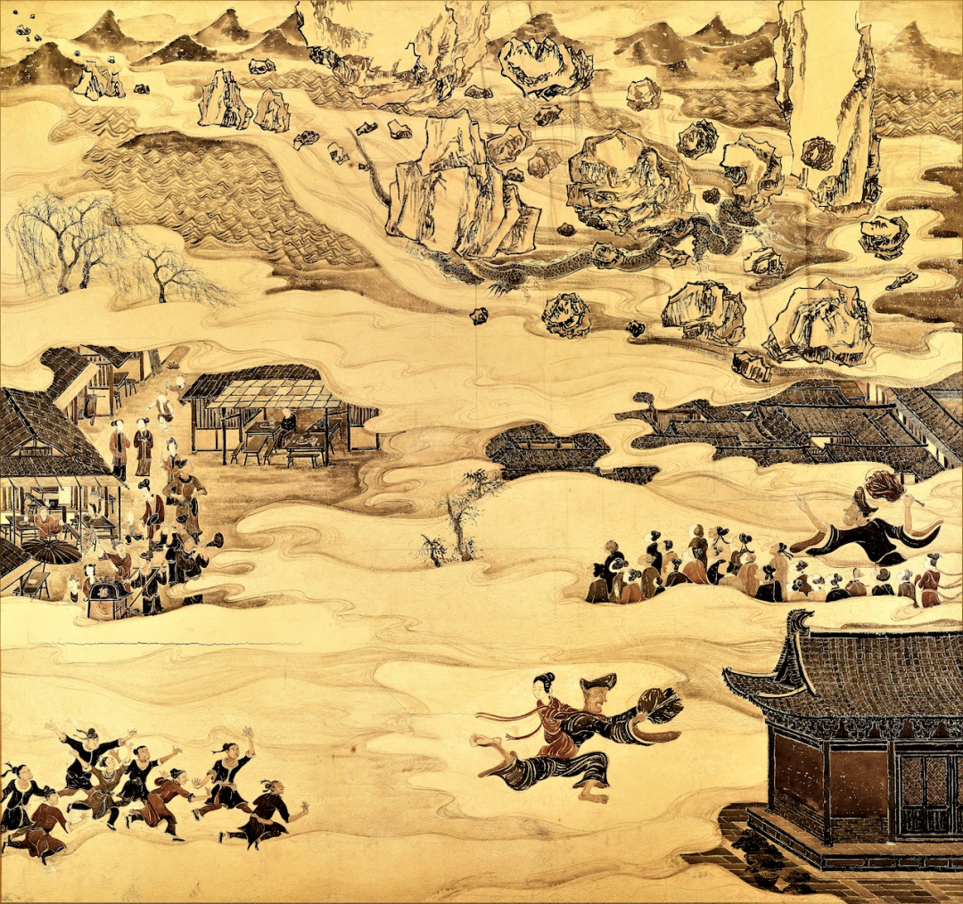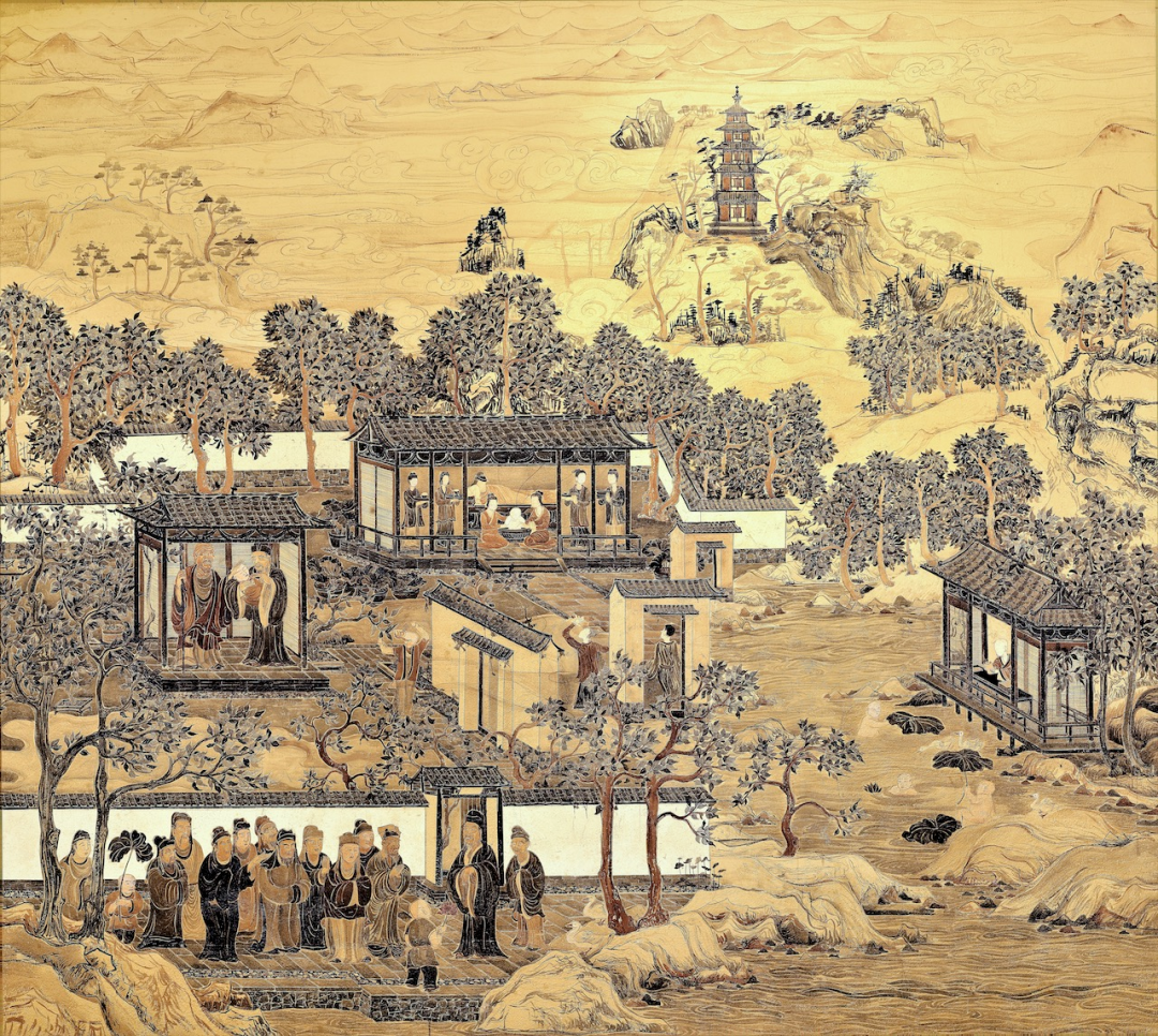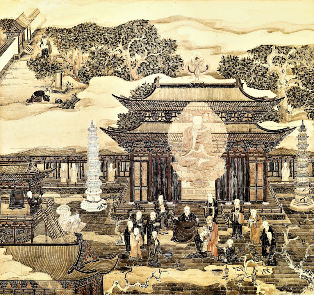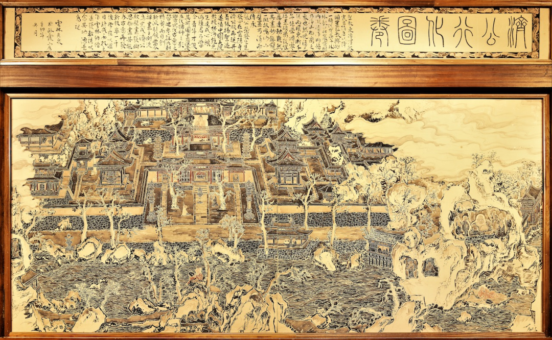 这十八幅壁画高三米、总长五十米,环绕济公殿四壁,色彩淡雅,如一幅江南山水画卷徐徐展开,展现着济公传奇的一生。从这些壁画中,人们还能看到南宋时的灵隐全貌,除了那笔意葱茏的山水景观,还能寻到许多当年都城的细节:灵隐寺、大悲楼、六和塔、净慈寺、雷峰塔、西湖、钱塘江……