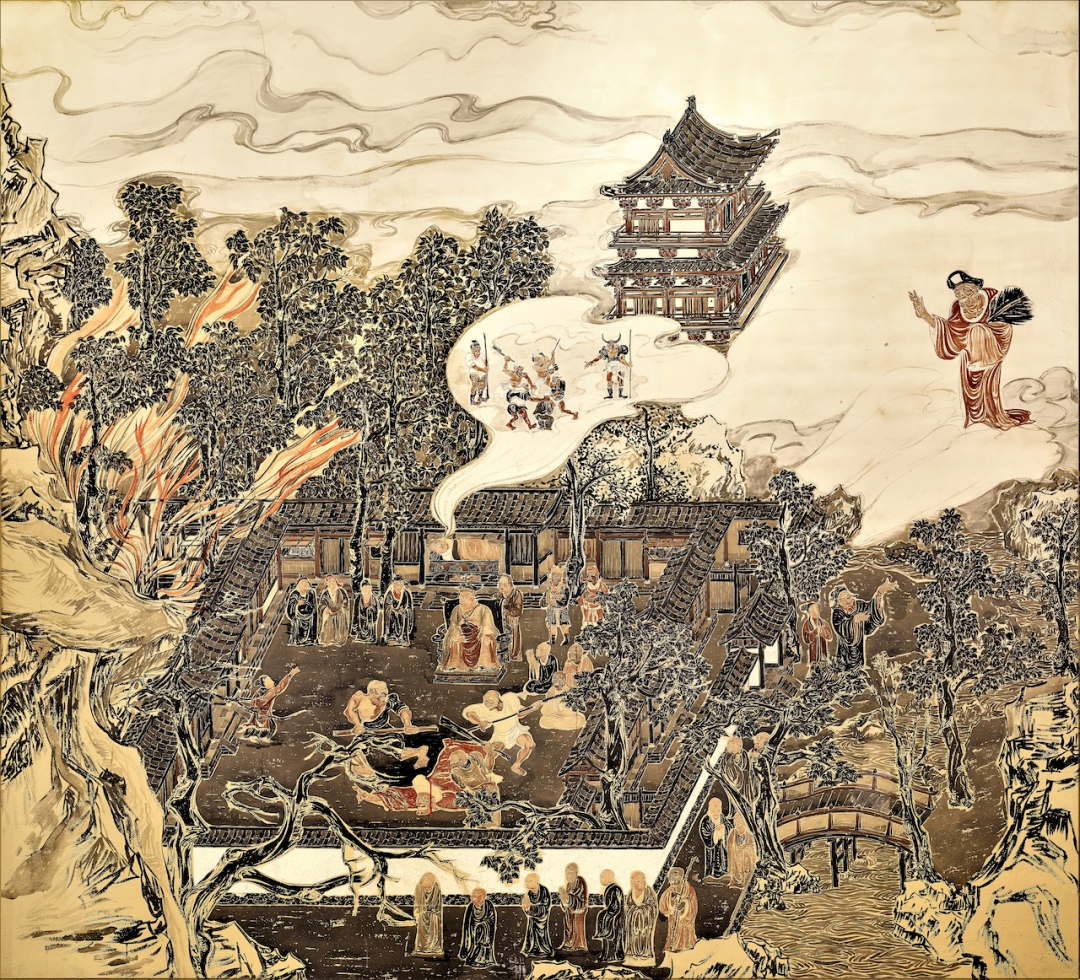 济公云游民间,降妖除魔,惩恶扬善,施药救人,普度众生。众善铭记在心,当得知济公誓愿,便出手相助,布施重金,重修大悲楼。立柱上梁之日,众善欢喜。