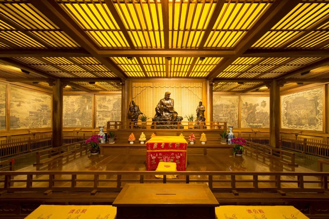 灵隐寺在药师殿东侧有济公殿,其中不仅供奉着依照清末画僧竹禅法师所作济公画像而塑造的道济禅师铜像,还在殿内四周墙壁上陈列着十八幅描绘道济禅师生平的壁画。