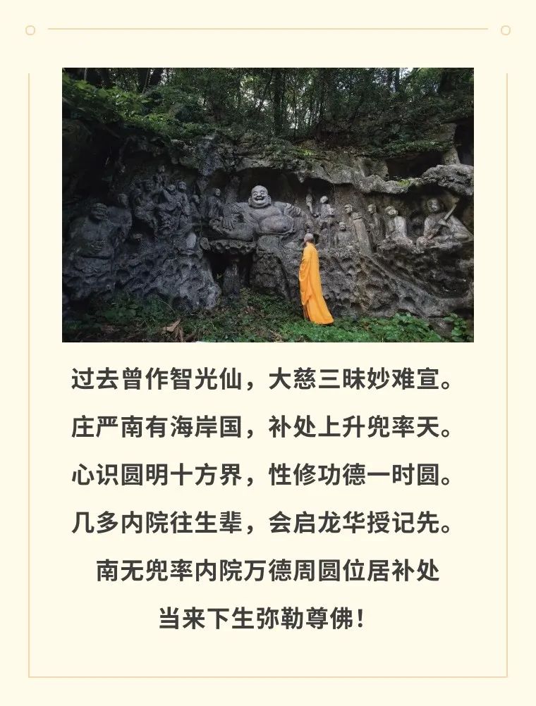 弥勒菩萨先于释迦牟尼佛入灭,他上生到兜率陀天弥勒内院,等待将来机缘成熟,下生人间,弘扬佛法,广度众生。根据《佛说弥勒下生成佛经》的记载,再过五十六亿七千六百万年,弥勒菩萨当下生于阎浮提,证得佛果。