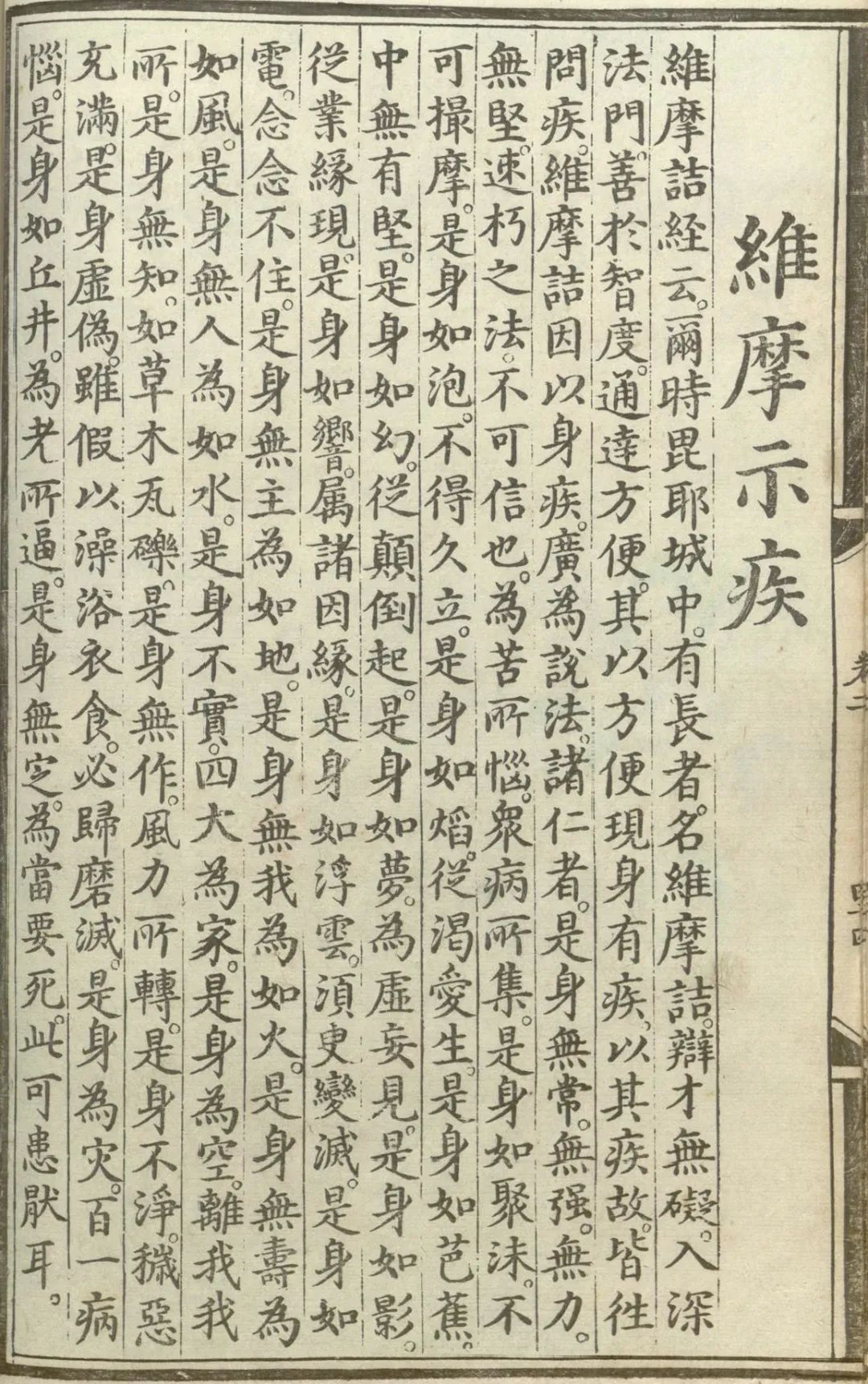 维摩诘因以身疾。广为说法。诸仁者。是身无常。无强无力无坚。速朽之法。不可信也。为苦所恼。众病所集。是身如聚沫。不可撮摩。是身如泡。不得久立。是身如焰。从渴爱生。是身如芭蕉。中无有坚。是身如幻。从颠倒起。是身如梦。为虚妄见。是身如影。从业缘现。是身如响。属诸因缘。是身如浮云。须臾变灭。是身如电。念念不住。是身无主。为如地。是身无我。为如火。是身无寿。为如风。是身无人。为如水。是身不实。四大为家。是身为空。离我我所。是身无知。如草木瓦砾。是身无作。风力所转。是身不净。秽恶充满。是身虚伪。虽假以澡浴衣食。必归磨灭。是身为灾。百一病恼。是身如丘井。为老所逼。是身无定。为当要死。此可患厌耳。