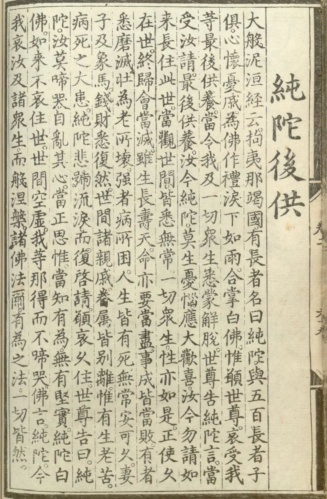 世尊告纯陀言。当受汝请最后供养。汝今纯陀莫生忧恼。应大欢喜。汝今勿请如来长住此世。当观世间皆悉无常。一切众生性亦如是。正使久在世。终归会当灭。虽生长寿天。命亦要当尽。事成皆当败。有者悉磨灭。壮为老所坏。强者病所困。人生皆有死。无常安可久。妻子及象马。钱财悉复然。世间诸亲戚。眷属皆别离。惟有生老苦。病死之大患。