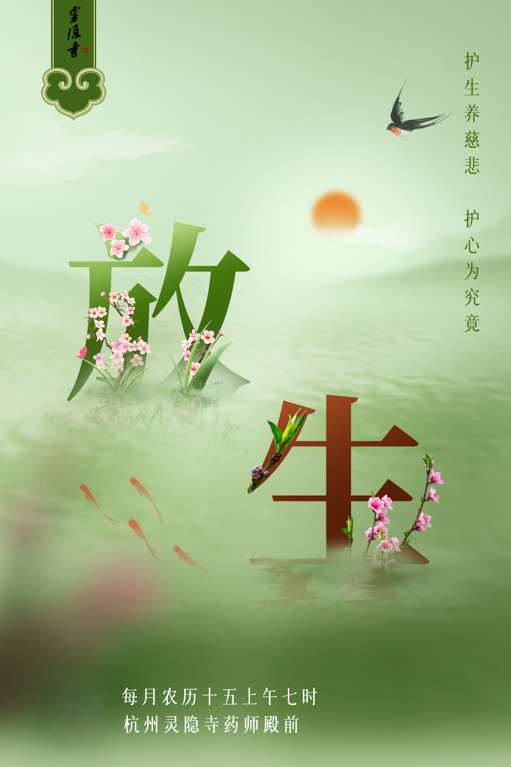 本月放生祈福法会将于2023年3月6日上午七时在杭州灵隐寺药师殿前举行,欢迎各位信众参加。
