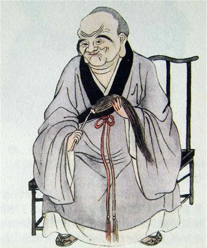 尊者法相所现为正面而坐,长眉大耳,神态严肃,双手捧拂子。