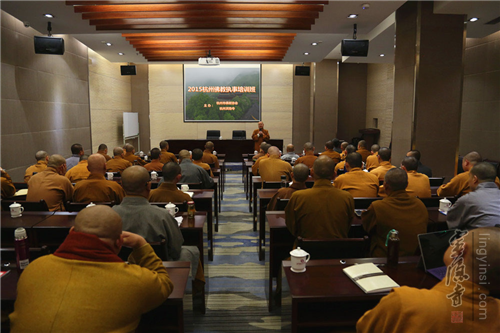 杭州市佛教协会会长、灵隐寺方丈光泉大和尚在开班仪式上动员大众珍惜难得的学习机会,本次培训班聘请的授课教师都是北大、清华以及各专业的优秀专家,大众要抓住集中学习的宝贵时间,丰富知识结构,拓展知识层面。他在致辞时强调,佛教僧团要与社会紧密结合,以所学、所思、所悟,去引领大众服务社会,通过自我的提升,自我的完善,去更好的弘法利生,圆满僧人的使命,希望大家都能在学习中安顿身心,有所受益。