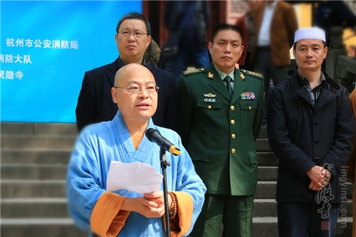 杭州市佛教协会会长、灵隐寺方丈光泉法师在运动会开幕式上致辞。他表示:现代宗教活动场所既是风景旅游胜地,又是对外友好交流的窗口。佛道教活动场所建筑以木结构为主,消防安全工作是重中之重。