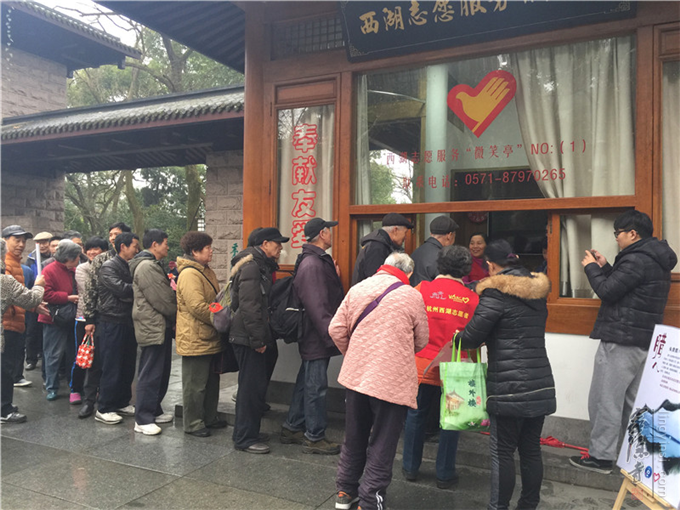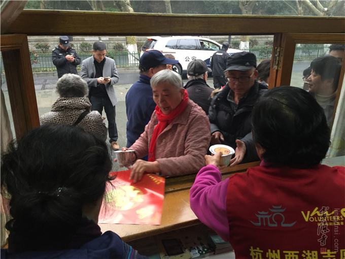 腊八节当日,西湖志愿服务微笑亭连续第4年向市民游客发放腊八粥,随粥赠送的还有新年福字贴。虽然是阴雨天气,但微笑亭因有了腊八粥,现场气氛温暖火热。每个亭200余份腊八粥,不到半小时就全部发放完,发放现场秩序井然。市民游客在腊八节里,感受到了传统节日的氛围,为新的一年祈福。一位外地游客拿到腊八粥后,表示没有想到今年身在异乡也能吃到腊八粥,惊喜之余也感受到了西湖的温情。志愿者的微笑是西湖最好的名片,志愿者的服务是西湖最美的风景。