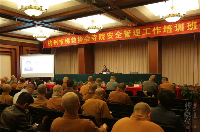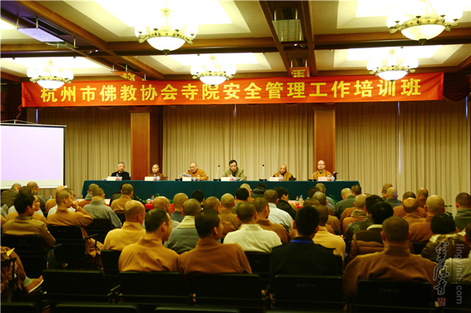 2017年3月3日,杭州市佛教协会寺院安全管理工作培训班在杭州灵隐寺开班。杭州市民族宗教事务局党组书记、局长杨志刚,杭州市佛教协会副会长定本法师、月真法师、智圆法师、戒兴法师,秘书长钱俭忠以及全市各寺院负责法师一同参加了培训。