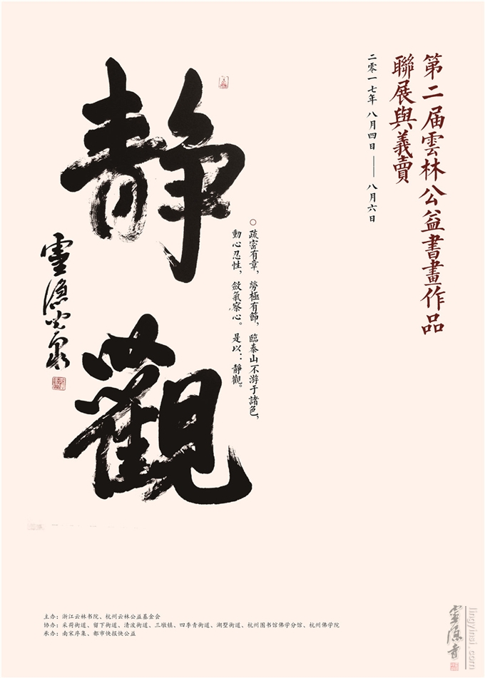 为了继续弘扬中华优秀传统文化,挖掘杭州深厚的城市历史文脉,鼓励社会各界热心公益,2017年云林书院继续携手采荷街道、留下街道、清波街道、三墩镇、四季青街道、湖墅街道、杭州图书馆佛学分馆和杭州佛学院等单位,共同举办"第二届云林公益书画作品联展与义卖"活动。并且将以书画作品的义卖所得为基数,正式在各参展街道启动"云林孝慈专项基金"项目。
