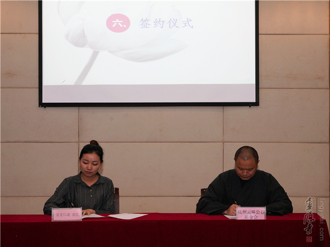 当天下午举行了2018年度"尚德学子优秀公益项目专项支助"签约仪式。首批获得资助的三个团队分别是:杭州电子科技大学"盲盲仁海"团队、浙江水利水电学院"《特色水情教育》课程体系建设"团队、浙江传媒学院"移动三脚架志愿服务"团队。杭州云林公益基金会理事长常法法师分别与三个团队的代表签署了为期三年的专项资助协议。