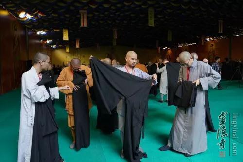 随后,芳振律师为新戒弟子讲解并演示穿脱海青的分解动作。新戒戒子认真聆听,反复演练穿脱海青,众引礼师在旁矫正戒子不规范的动作。海青又称"大袍",款式腰宽袖阔,圆领方襟。新戒弟子着青黑海青,黄色海青为寺院方丈或法会主法者所穿。