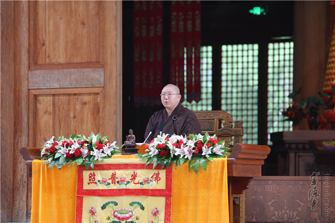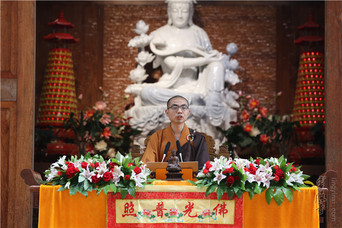 首先登座的是曾在2017年中国佛教讲经交流会上获得过金莲花一等奖,山东大灵岩寺的弘恩法师,他为大众宣讲了《如何建立信仰》。法师以分析"信仰"在中西方文化中的不同含义入手, 继而推导出什么是正信以及如何建立正信。法师引用古德的话说:"法从恭敬中求。信而不敬,所信必浅;敬而不信,所信必滥。"所以,建立对三宝的坚定信仰是修行之根本。我们正见的建立,也一定要依靠"信佛、信法、信僧"。