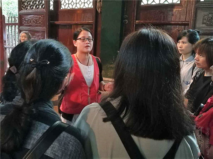 讲解组的志工在天王殿介绍灵隐寺的整体布局