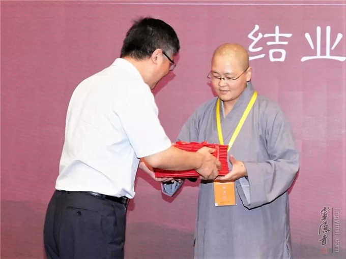 中国佛教协会副会长静波法师、中国佛教协会秘书长刘威为"2018中国佛教讲经研习班"学员颁发结业证书。