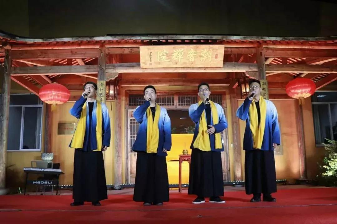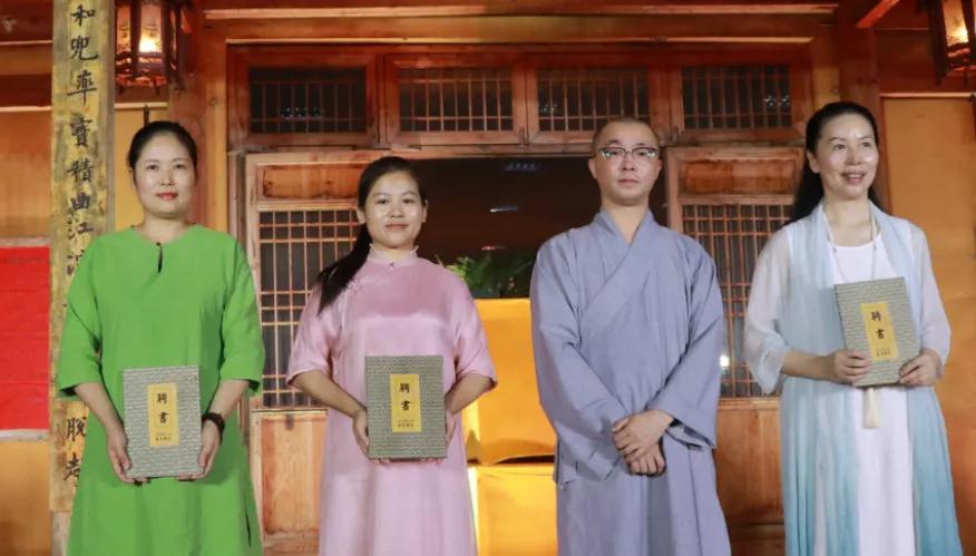 在晚会上,潮音禅院监院慧仁法师为潮音禅院梵呗团艺术指导黄馨老师颁发了聘书。为刘桂萍、余青芝两位茶道指导老师颁发聘书。潮音禅茶社同时宣告成立。