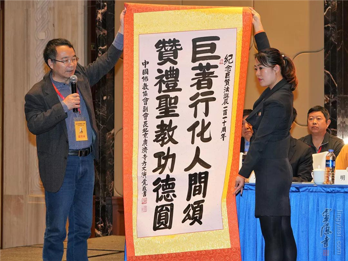 纪念巨赞法师诞辰110周年文化系列活动,受到佛教界和佛教学术研究机构的广泛关注,纷纷致电来函祝贺活动开幕。中国佛教协会驻会副会长演觉法师亲自为大会挥毫题词:"巨著行化人间颂,赞礼圣教功德圆。"