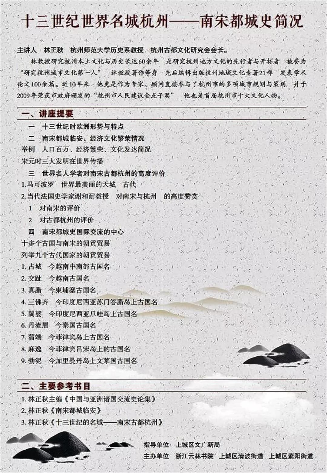 11月3日下午,"十三世纪世界名城杭州——南宋都城史简况"讲座在杭州西湖博物馆学术报告厅内举行,100多位对南宋、对杭州历史感兴趣的朋友专程赶来,聆听讲座。这次讲座由浙江云林书院与上城区清波街道、紫阳街道共同举办,为纪念南宋建都880周年系列活动之一。