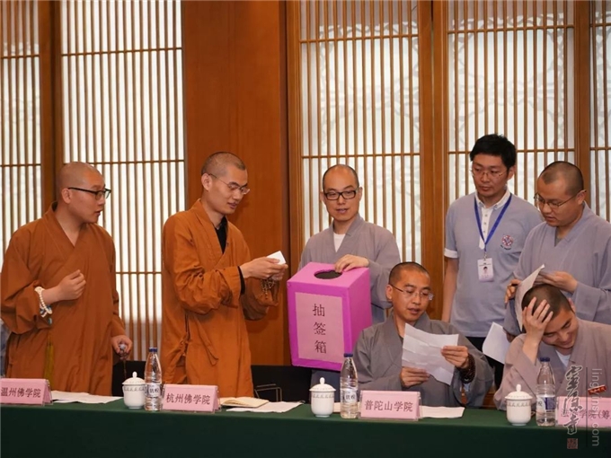 5月27日, "2018佛教论辩会"领队会议在杭州灵隐寺召开。来自全国20支佛学院代表队的领队参加会议,就赛制规则设置、论辩辩题确认、论辩陈述环节等疑问进行了充分交流。随机抽取参与论辩会的佛学院代表队排序,确认辩题以及首轮出场论辩方。
