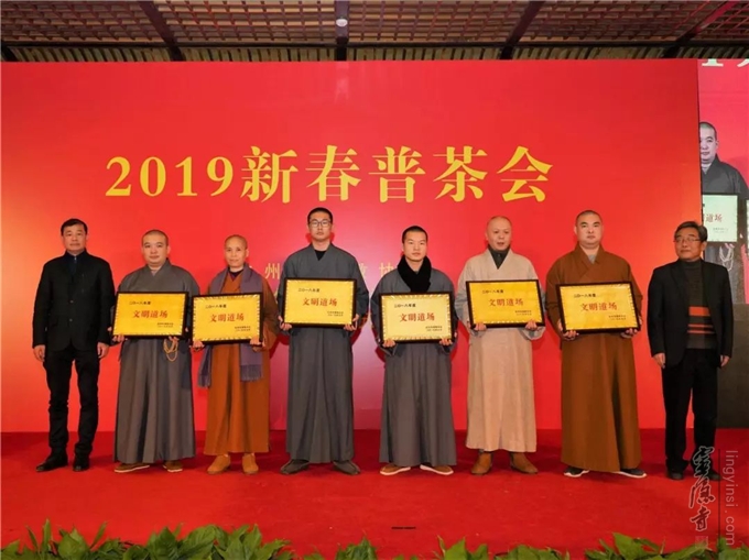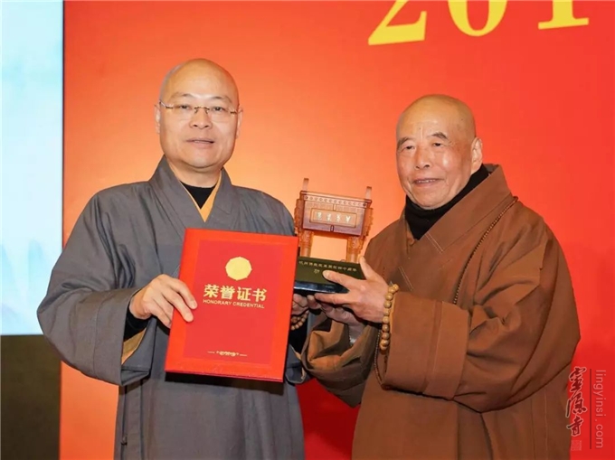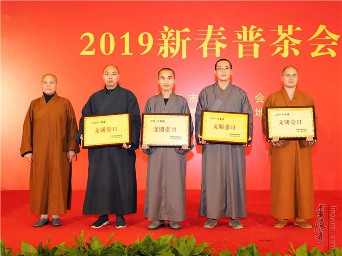 在表彰会上,杭州灵隐寺荣获2018年度"文明道场"奖,灵隐寺流通处、基建办获2018年度"文明堂口"奖,十三位法师获"先进个人"奖。