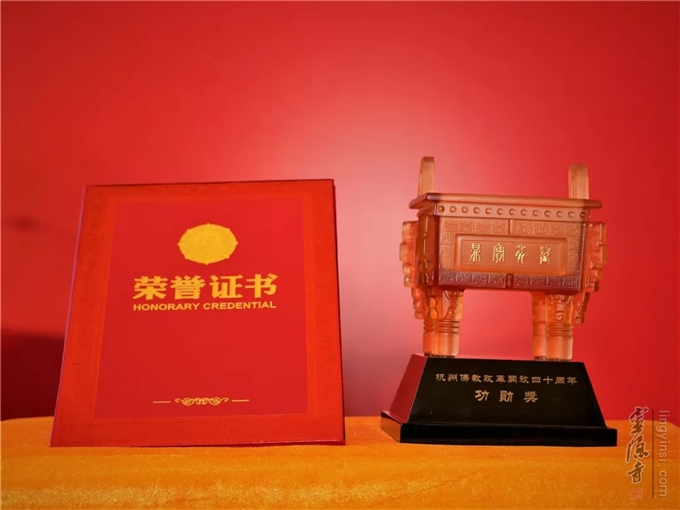 "杭州佛教改革开放四十周年功勋奖"奖杯与证书